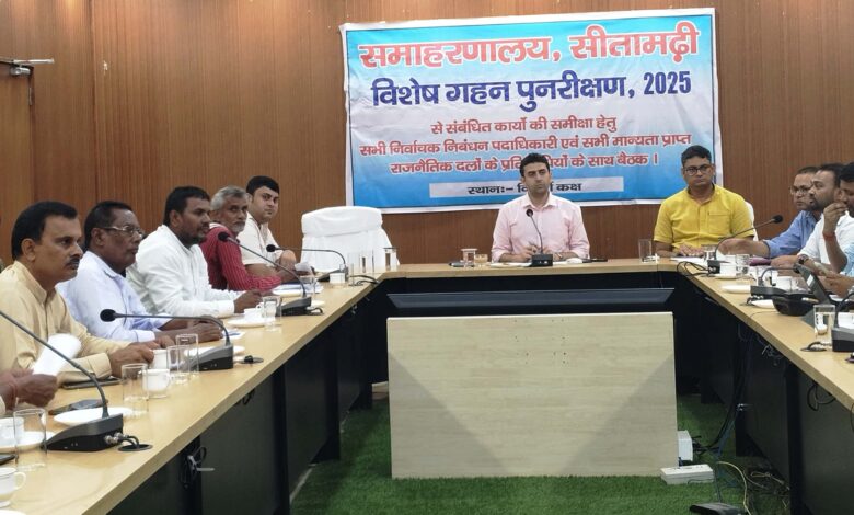 जिला निर्वाचन पदाधिकारी-सह-जिला पदाधिकारी रिची पाण्डेय की अध्यक्षता में सीतामढ़ी समाहरणालय स्थित विमर्श कक्ष में सभी मान्यता प्राप्त राजनीतिक दलों के प्रतिनिधि के साथ विशेष गहन पुनरीक्षण 2025 के संबंध में विचार विमर्श हेतु बैठक किया गया। बैठक में उप-निर्वाचन पदाधिकारी विपिन कुमार, सभी निर्वाचक निबंधन पदाधिकारी के साथ जदयू के प्रतिनिधि सुदेश कुमार शाही, राष्ट्रीय जनता दल के प्रतिनिधि गौहर अली, इंडियन नेशनल के जिला अध्यक्ष रक्टु प्रसाद, सीपीएम के सचिव देवेंद्र यादव, बीजेपी के प्रतिनिधि अरुण गोप, बहुजन समाजवादी पार्टी के जिला अध्यक्ष सहदेव राम एवं राष्ट्रीय लोक समता पार्टी के प्रतिनिधि सजीर आलम उपस्थित थे। बैठक में उन्हें अब तक सीतामढ़ी जिला अंतर्गत आठ विधानसभा निर्वाचन क्षेत्र में हुई प्रगति के बारे में विस्तृत रूप से चर्चा की गई। तथा उन्हें मतदान केंद्रवार विधानसभावार सभी विधानसभा निर्वाचन क्षेत्र की ऐसे निर्वाचक की सूची उपलब्ध कराई गई जिन्होंने अभी तक अपना गणना प्रपत्र समर्पित नहीं किया है साथ ही अब तक विधानसभावार कितने गणना प्रपत्र को अपलोड किया जा चुका है एवं मृत, दोहरी प्रविष्टि, और स्थाई रूप से स्थानांतरित निर्वाचकों की सूची पर विस्तृत रूप से चर्चा की गई और उनसे अनुरोध किया गया कि उक्त सूची की सत्यापन अपने बीएलए के माध्यम से करा लिया जाए तथा वैसे निर्वाचको से जिन्होंने अभी तक अपना गणना प्रपत्र नहीं भरा है उनसे अनुरोध किया जाए की स-समय अपना गणना प्रपत्र बीएलओ को उपलब्ध कराएँ या फिर ऑनलाइन माध्यम से खुद से अपलोड कर दे। उपस्थित प्रतिनिधियों के द्वारा आश्वासन दिया गया कि हम लोग शीघ्र ही सूची के सत्यापन के साथ ही सभी निर्वाचकों से अनुरोध करेंगे कि अपना गणना प्रपत्र यथाशीघ्र जमा कर दें।