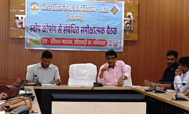 सीतामढ़ी समाहरणालय स्थित विमर्श सभा कक्ष में जिला स्वीप कोषांग की बैठक उप-विकास आयुक्त संदीप कुमार की अध्यक्षता में की गई। बैठक में डीपीआरओ कमल सिंह, डीसीएम समरेंद्र नारायण वर्मा सहित विभिन्न विभागों के पदाधिकारी सहित शिक्षा विभाग, आईसीडीएस,जीविका स्काउट एंड गाइड, स्वास्थ्य विभाग, जिला जल एवं स्वच्छता समिति, दिव्यांगजन सशक्तिकरण विभाग एवं स्वास्थ्य विभाग के प्रतिनिधियों ने भाग लिया। बैठक में उपस्थित पदाधिकारियों को संबोधित करते हुए उप-विकास आयुक्त ने निर्देश दिया कि सभी विभाग परस्पर समन्वय के साथ कार्य करते हुए नियमित रूप से स्वीप गतिविधि चलाना सुनिश्चित करें। उन्होंने कहा कि सभी विधानसभा क्षेत्र में उन बूथों पर जहां कम मतदान हुए वहां सघन जागरूकता कार्यक्रम चलाया जाए साथ ही शिक्षा विभाग को निर्देशित किया गया कि सभी विद्यालयों/ महाविद्यालयों में इलेक्टोरल लिटरेसी क्लब की सक्रियता सुनिश्चित की जाए। छात्रों द्वारा मानव श्रृंखला, रैली, प्रभात फेरी, निबंध एवं क्विज प्रतियोगिता का नियमित रूप से आयोजन करें। वही आईसीडीएस को निर्देश दिया गया कि आंगनबाड़ी केंद्रों के माध्यम से ग्रामीण महिलाओं में मतदान जागरूकता हेतु प्रेरित करें। जिला समन्वयक,  जिला जल एवं स्वच्छता समिति को निर्देश दिया गया कि ग्रामीण क्षेत्रों में अपने संसाधनों के माध्यम से मतदाता जागरूकता अभियान चलाना सुनिश्चित करें। वहीं सहायक निदेशक दिव्यांग जन सशक्तिकरण को निर्देश दिया गया कि स्कूल फॉर स्पेशल चिल्ड्रन, NGO, दिव्यांग संस्थानों में जागरूकता रैली का आयोजन करें। जिले के सभी दिव्यांग व्यक्तियों की अद्यतन सूची स्वीप कोषांग को उपलब्ध कराना सुनिश्चित करें। जिला स्तर पर एवं सभी विधानसभा निर्वाचन क्षेत्र में जिला स्वीप कोषांग के सहयोग से दिव्यांग मतदाताओं को जागरूक करने की दिशा में विभिन्न गतिविधियों का आयोजन करना सुनिश्चित करें।