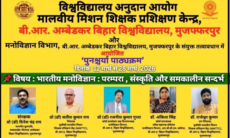 विश्वविद्यालय अनुदान आयोग-मालवीय मिशन शिक्षक प्रशिक्षण केंद्र-बी.आर अम्बेडकर बिहार विश्वविद्यालय और मनोविज्ञान विभाग के संयुक्त तत्वावधान में (Refresher Course) पुनश्चर्या पाठ्यक्रम प्रारम्भ
