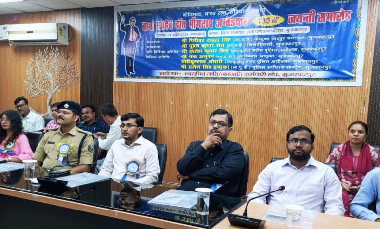 भारत रत्न बाबा साहब डॉ.भीमराव अंबेडकर की 135वीं जयंती मुजफ्फरपुर समाहरणालय परिसर में हर्षोल्लास एवं गरिमामय वातावरण में मनाई गई। इस अवसर पर समाहरणालय स्थित अंबेडकर उपवन में अधिकारियों, कर्मचारियों एवं गणमान्य अतिथियों ने उनकी प्रतिमा पर माल्यार्पण कर भावभीनी श्रद्धांजलि अर्पित की। माल्यार्पण करने वालों में तिरहुत प्रमंडल के आयुक्त गिरिवर दयाल सिंह, जिलाधिकारी सुब्रत कुमार सेन, वरीय पुलिस अधीक्षक कांतेश कुमार मिश्र, उप-विकास आयुक्त श्रेष्ठ अनुपम, नगर आयुक्त रितुराज प्रताप सिंह, अनुमंडल पदाधिकारी पूर्वी तुषार कुमार एवं अनुमंडल पदाधिकारी पश्चिमी आकांक्षा आनंद सहित कर्मचारी संघ के सदस्यगण, कई अन्य अधिकारीगण एवं गणमान्य अतिथिगण शामिल रहे। इसके उपरांत समाहरणालय सभागार में अनुसूचित जाति एवं जनजाति कर्मचारी संघ द्वारा एक भव्य समारोह का आयोजन किया गया, जिसका उद्घाटन अतिथियों द्वारा सामूहिक रूप से दीप प्रज्वलित कर किया गया। समारोह की अध्यक्षता प्रमंडलीय आयुक्त श्री सिंह ने की। समारोह में वक्ताओं ने बाबा साहब के व्यक्तित्व एवं कृतित्व पर विस्तार से प्रकाश डालते हुए उन्हें बहुमुखी प्रतिभा का धनी बताया साथ ही उनके विचारों, आदर्शों एवं सिद्धांतों को युवा पीढ़ी के लिए प्रेरणास्रोत बताते हुए उन्हें आत्मसात करने की आवश्यकता पर बल दिया। उन्होंने कहा कि डॉ. अंबेडकर न केवल भारतीय संविधान के शिल्पकार थे, बल्कि बहुआयामी व्यक्तित्व के धनी थे। समारोह के दौरान स्कूली छात्र-छात्राओं को प्रतीक चिन्ह एवं स्कूल बैग भेंट कर उनकी हौसला अफजाई की गई। कार्यक्रम के अंत में सभी उपस्थित लोगों ने बाबा साहब के दिखाये मार्ग पर चलने तथा उनके आदर्शों को अपने जीवन में अपनाने का संकल्प लिया।समारोह का संचालन जिला कोषागार पदाधिकारी सह जिला भविष्य निधि पदाधिकारी वैशुर रहमान ने की।