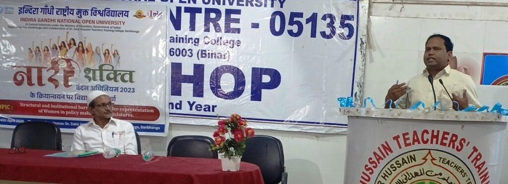 IGNOU क्षेत्रीय केंद्र, दरभंगा ने नारी शक्ति वंदन अधिनियम, 2023 के कार्यान्वयन के अंतर्गत “नीति निर्माण और विधायिकाओं में महिलाओं के अल्प प्रतिनिधित्व में संरचनात्मक और संस्थागत बाधाएं” विषय पर एक छात्र चर्चा का आयोजन किया। यह कार्यक्रम डॉ. जाकिर हुसैन शिक्षक प्रशिक्षण महाविद्यालय, लहरियासराय, दरभंगा में आयोजित किया गया। इस चर्चा में IGNOU और डॉ.जाकिर हुसैन शिक्षक प्रशिक्षण महाविद्यालय, दरभंगा दोनों के छात्रों ने भाग लिया। इस कार्यक्रम में IGNOU क्षेत्रीय केंद्र, दरभंगा के अधिकारियों और कर्मचारियों के साथ-साथ डॉ. जाकिर हुसैन शिक्षक प्रशिक्षण महाविद्यालय, दरभंगा स्थित IGNOU अध्ययन केंद्र के कर्मचारियों और छात्रों ने सक्रिय रूप से भाग लिया। इस अवसर पर मुख्य अतिथि सह क्षेत्रीय निदेशक, इग्नू, क्षेत्रीय केंद्र, दरभंगा डॉ.संतन कुमार राम ने नारी सशक्तिकरण पर जोर देते हुए कहा कि जब तक महिलाएं किसी भी कार्य को करने में खुद निर्णय नहीं लेंगी या लीडरशिप की भूमिका में नहीं होगी तब तक नारी सशक्तिकरण सफल नहीं होगा। इसके लिए उन्हें प्राथमिकता के तौर पर देखना होगा। महिलाओं को शिक्षा, जागरूकता एवं समान अवसर देना होगा। आगे उन्होंने कहा कि महिलाओं की संख्या को देखते हुए संसद एवं विधायिकाओं में उनकी भागीदारी अभी भी बहुत कम है जो एक गंभीर समस्या बनी हुई है। अवसर मिलने पर महिलाएं भी उत्कृष्ट कार्य कर सकती हैं। सरकार द्वारा महिलाओं के उत्थान एवं सर्वांगीण विकास के लिए चलाई गई योजना उन्हें आर्थिक रूप से सशक्त बनाती है। किसी भी क्षेत्र में महिलाओं की सक्रिय भागीदारी से ही राष्ट्र एवं समाज का समग्र विकास संभव है। मजबूत एवं संतुलित लोकतंत्र के निर्माण के लिए हमें मिलकर काम करना होगा। उन्हें केवल घर तक ही सीमित रखा जाता है. डॉ. राम नें कहा कि जब तक महिलाओं के प्रति लोगों का नजरिया एवं सामाजिक सोच नहीं बदलेगा तब तक वह आगे नहीं बढ़ सकतीं। महिलाओं का सभी क्षेत्रों में पूर्ण भागीदारी सुनिश्चित करनी होगी। राजनीति में महिलाओं की सक्रिय भागीदारी को लेकर भी बातें की गईं। यदि महिलाओं को सभी क्षेत्रों में आगे बढ़ना है तो उन्हें जागरूक करना बहुत जरूरी है। अंत में यह कहा गया कि जब तक महिलाएं शिक्षित एवं आत्मनिर्भर नहीं बनेगी तब तक महिला सशक्तिकरण की बात करना निरर्थक होगा। क्षेत्रीय निदेशक डॉ.राम ने अपने संबोधन में महिलाओं के आरक्षण को लेकर विस्तार से अपनी बातें रखीं। उन्होंने बिहार में पंचायती राज में महिलाओं को 50% एवं नौकरियों में 33% आरक्षण को लेकर उल्लेख किया। इस अवसर पर मुख्य वक्ता सह डॉ.जाकिर हुसैन शिक्षक प्रशिक्षण महाविद्यालय, दरभंगा के सहायक प्राध्यापक मुसर्रत फैजी ने अपने संबोधन में कहा कि नीति निर्